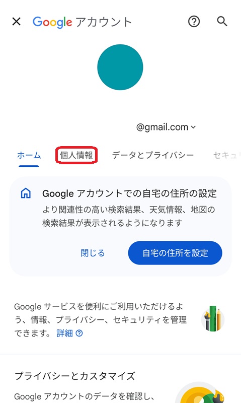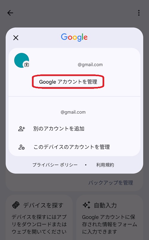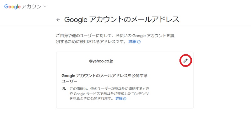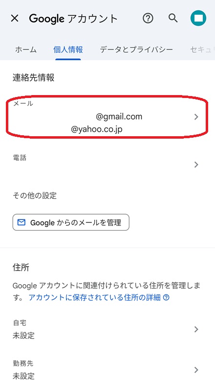 2.「Google アカウントのメールアドレス」の欄に書かれているアドレスをクリックする