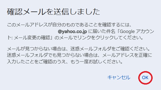 5.「確認メールを送信しました」というメッセージが出るので「OK」をクリックする