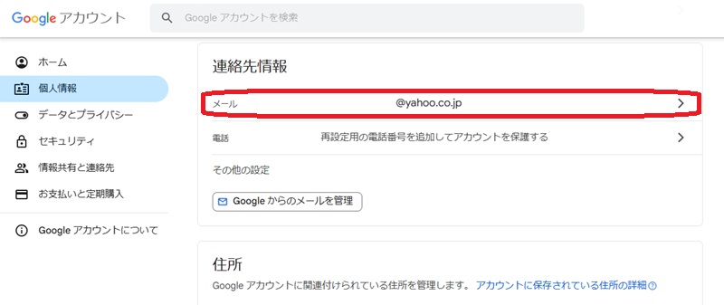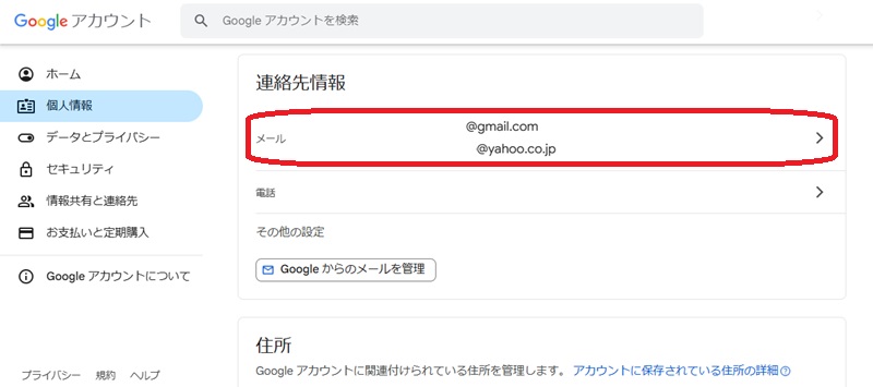 1.「Googleアカウント」のページから「個人情報」「連絡先情報」と進み、「メール」をクリックする