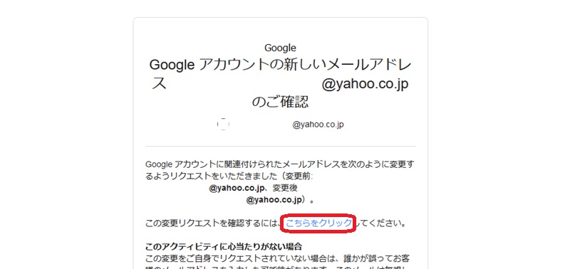 6.新しく登録したアドレス宛に「Google アカウント: メール変更の確認」というタイトルのメールが届くので、内容を確認し、本文内の「こちらをクリック」をクリックする