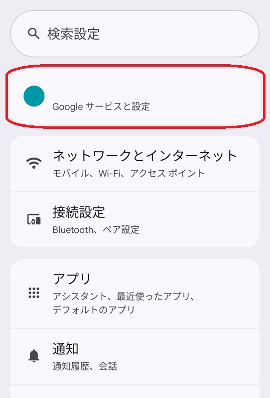 1.デバイスの設定アプリを起動させ、「〇〇(ユーザー名) Google サービスと設定」をタップする