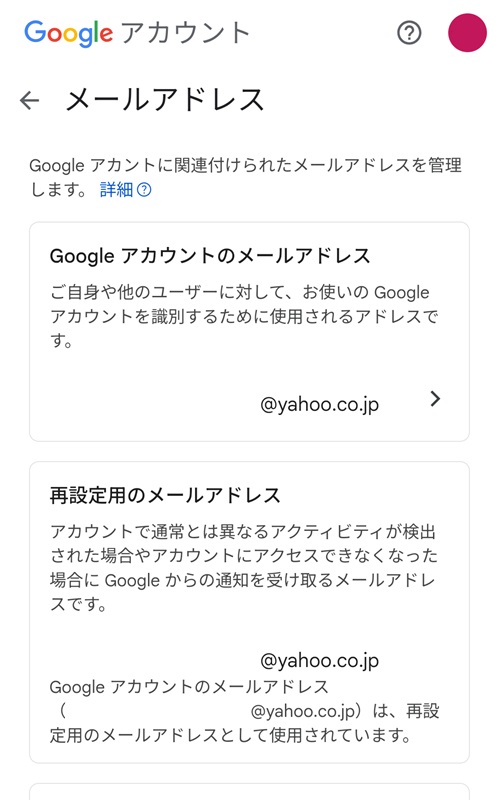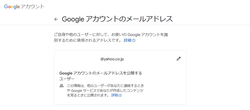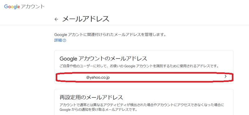 5.「Googleアカウントのメールアドレス」の欄をチェックする。メールアドレスの右側に矢印のマークが表示されていれば変更可能