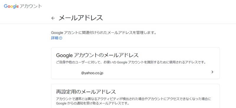 4.「Googleアカウントのメールアドレス」の欄をチェックする。メールアドレスの右側に矢印のマークが表示されていれば変更可能