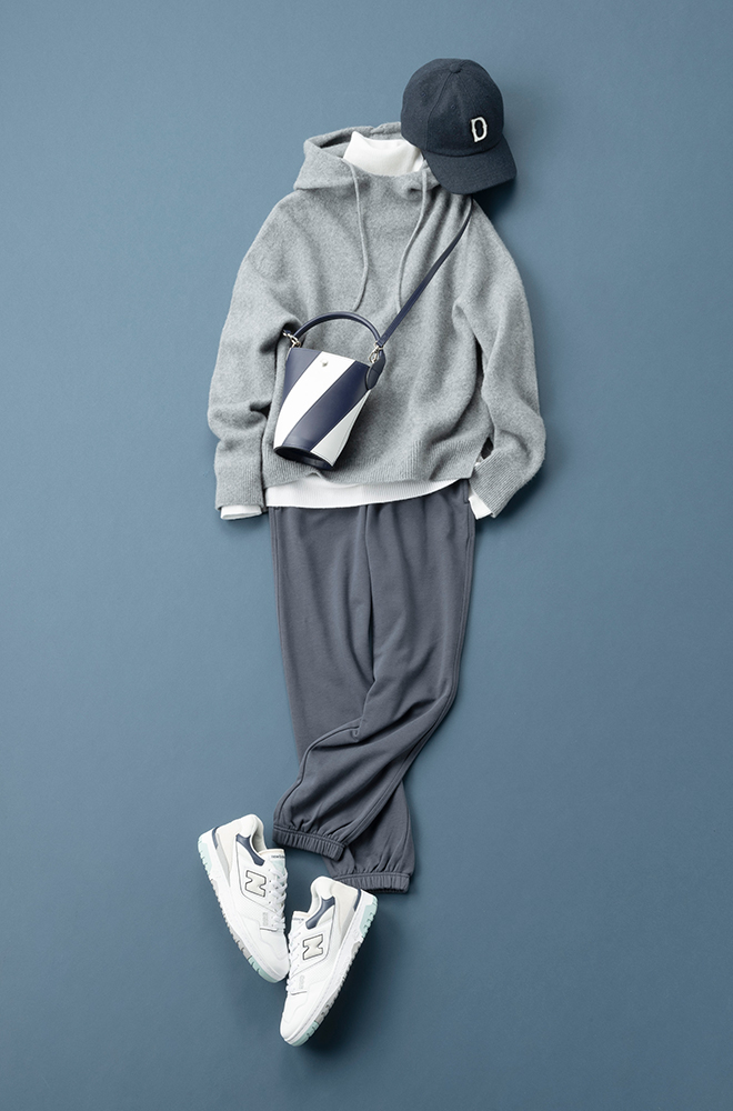 パンツ¥1,990(GU) ニットパーカ¥19,800(ドレステリア 渋谷スクランブルスクエア店〈ドレステリア〉) 中に着たニット¥8,800(クロスプラス〈ノーク〉) 帽子¥3,993(ワールド プレスインフォメーション〈デッサン〉) バッグ¥64,900(ロンシャン・ジャパン〈ロンシャン〉) 靴¥17,600(ニューバランスジャパンお客様相談室〈ニューバランス〉)