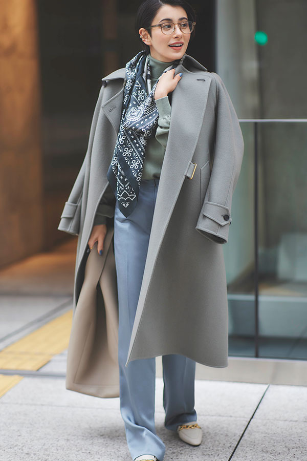 くすみ系寒色同士をつなぐことで、洗練された印象が漂いつつまろやかムードに。ワントーン配色を成功させるコツは、とろみパンツなどどこかに艶めきアイテムを投入すること。着こなしにリズムが生まれて、もっさり見えも上手に回避できる!