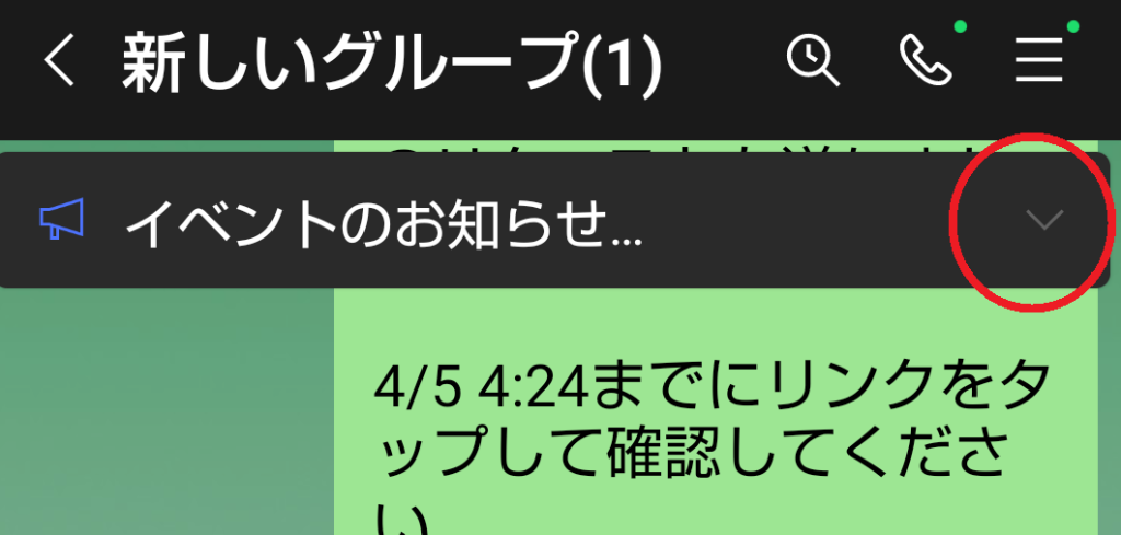 先ほど同じく、トークルーム上部に表示されているアナウンスのメッセージ右側の「∨」をタップします。
