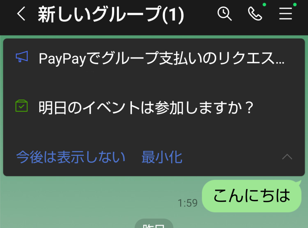 アナウンス機能を使用した後は、画像のようにトークルーム上部に表示されます。このアナウンスを解除・非表示・最小化する方法を解説します。