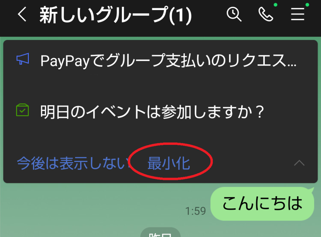 「最小化」は、トークルーム上部に表示されているアナウンスをメガホンマークのみ表示する形式に切り替える機能です。アナウンスは残しておきつつ、トークルームで目立たなくしたいときに使えます。