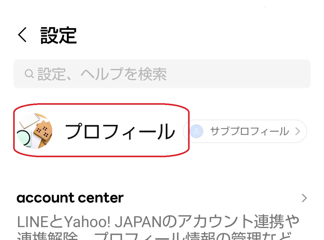 以下の画像のように設定画面へ移りますので、検索バーのすぐ下にある「プロフィール」をタップします。