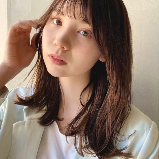 鎖骨下5cmのミディアムベース。ハチ上にレイヤーを入れ、前髪は、サイドには厚みと長さを残しながらも真ん中は眉下の長さで薄くつくり、カットラインの生きたシースルーバングにする。