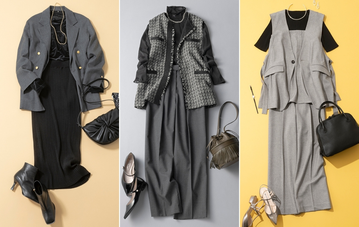 黒とグレーの落ち着いたダークトーン。黒ベースに白糸を織り込んだツイードジレをプラスすれば、落ち着きをキープしながらも華やかさあるコーディネートに。