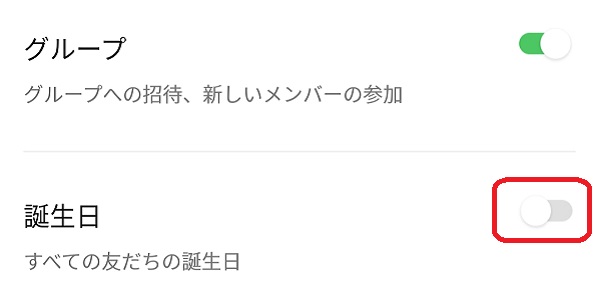 友だちの誕生日当日の通知を「お知らせ」に表示させない方法では、全ての友だちの通知がこない設定にできます。特定の友だちについて誕生日当日の通知をオフにすることはできません。