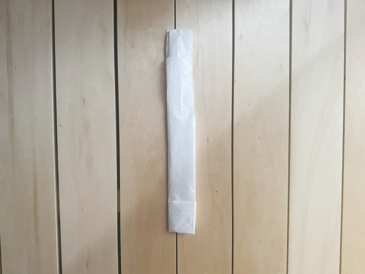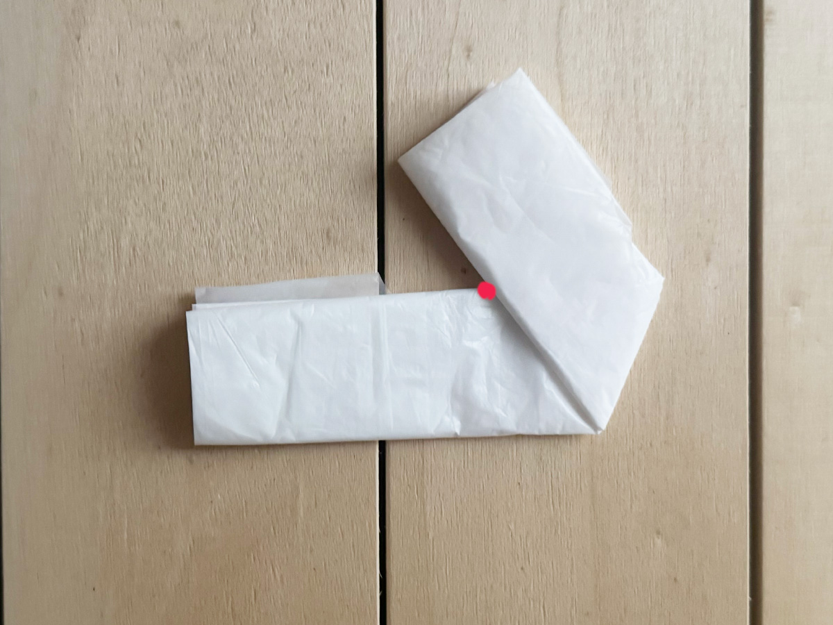6. レジ袋の端を折りたたんで四角形のポケットに入れる