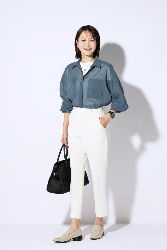 くすみブルーのシアーシャツが、クリーンな白のワンツーコーデにこなれ感をもたらして。ゆるっとしたシルエットや大きめのポケットが、コーデにメリハリをつけてくれる。