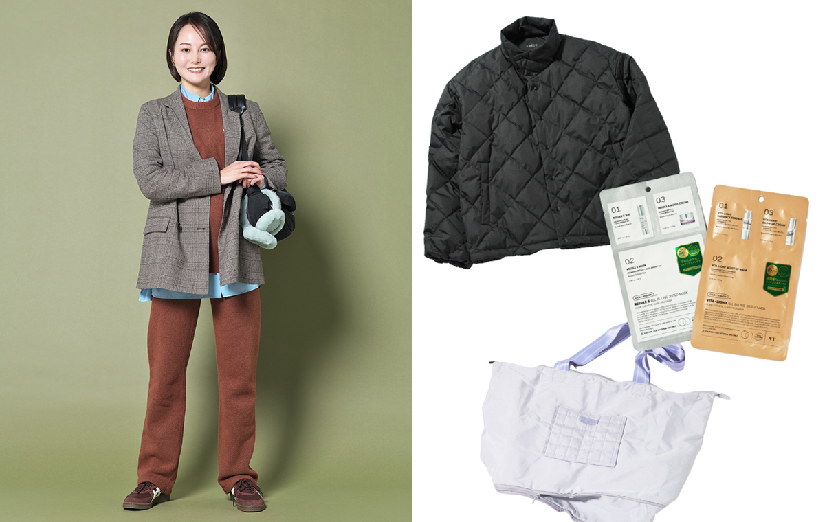 「折りたたんで収納できるケース付きのダウンジャケットは、冬の旅に欠かせません。もともとダウンベストを愛用していて、ジャケットも追加で購入しました。冬はアウターでコーデの印象が決まりやすいので、1日めの移動時にはジャケット、2日めはこのダウンジャケット、とすれば見た目印象をガラッと変えられる点も高ポイント。薄くて軽いのにしっかり暖かいです! 」(鈴木さん)