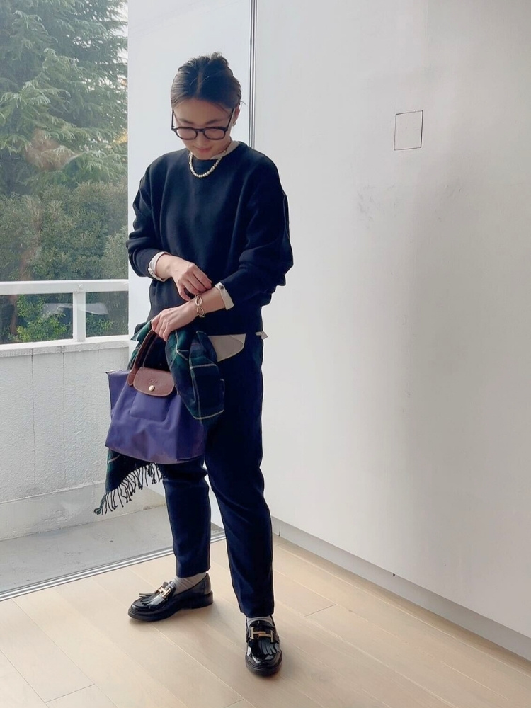 最初はオフィスでも違和感なく着用できる黒スウェットを探していたのですが、結局スウェットって生地感に引っ張られて休日服になりがちなんだよな~(ズボラだからということは置いておいて)と思っていたところ、出合ったのがこちら。襟元の感じはスウェット感がありますが、「スムース」という名のとおりハリがあるコットン生地で、きれいめの印象なんです。
