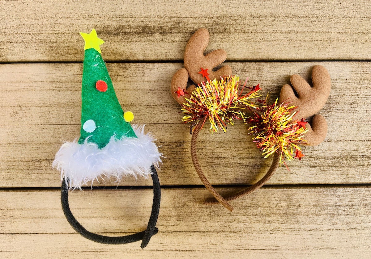 普段着でもこのカチューシャをつけるだけでクリスマス感アップ! 布が全体に巻いてあるので、耳の後ろが痛くなりにくいのもうれしい。クリスマスツリーデザインのカチューシャにはふわふわのファーが、トナカイカチューシャにはキラキラの飾りがついています。