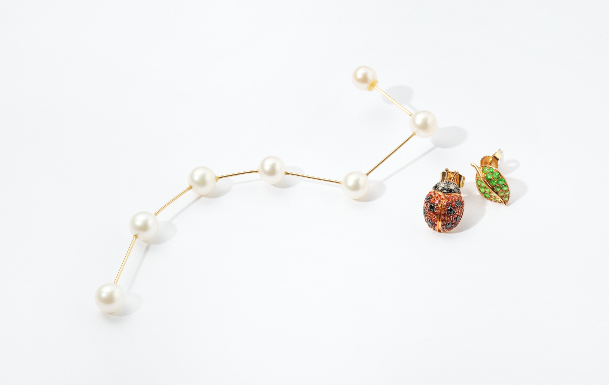 「春夏になると出番が増えるのが、てんとう虫と葉っぱのピアス。こちらはセットアイテムではなくて、それぞれ片耳ピアスで展開されているものなんです。ストーリー性のあるジュエリーを自分らしくファッションに取り入れられるのも魅力に感じています」(和田さん)