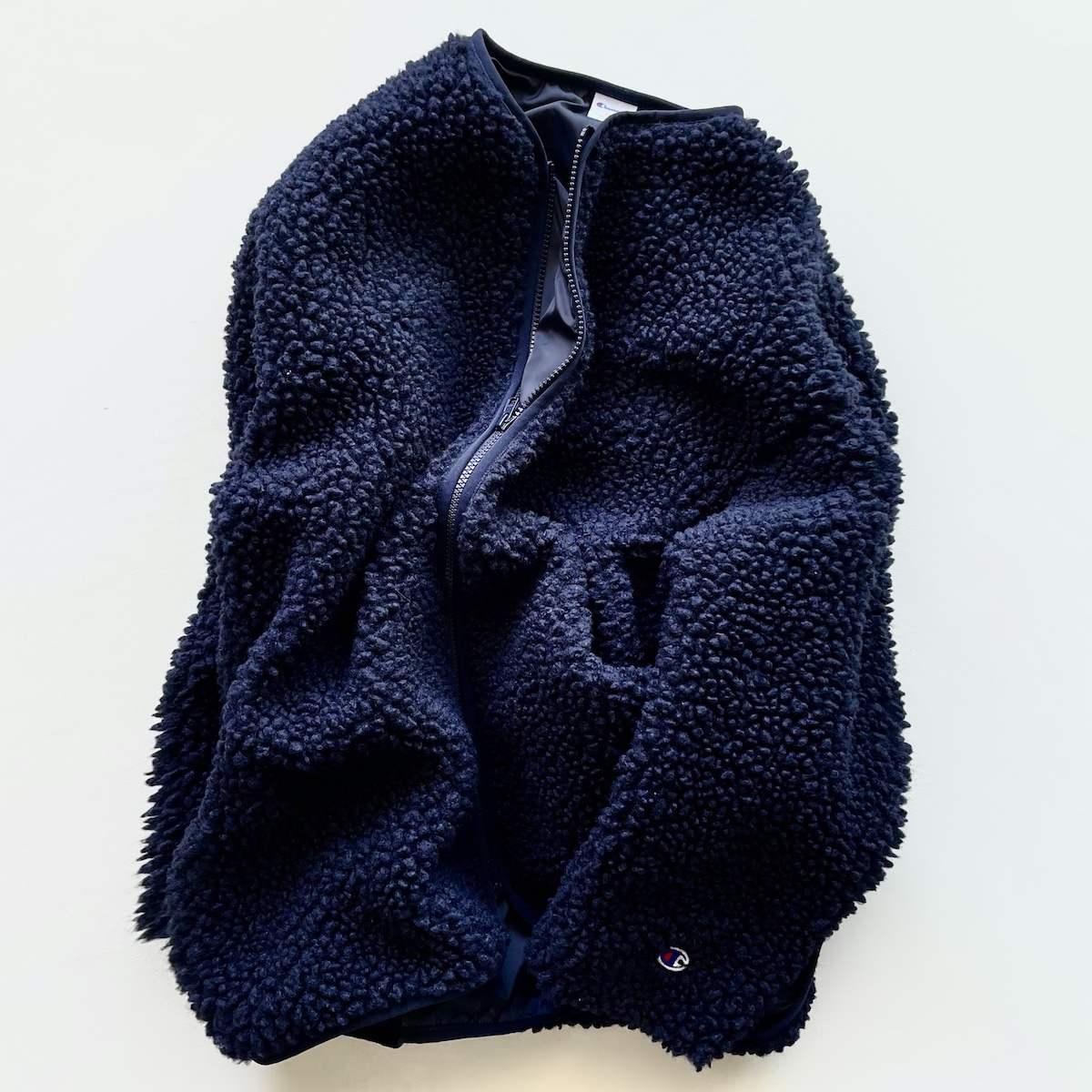 実際の画像は、このあとの【今日のひと手間】に載せますが、最終的に私が選んだのは、“ジャーナルスタンダード レリューム”別注の“チャンピオン”のプードルボアのジャケットでした。色はネイビー!最初、自分の中にネイビーという選択肢はなかったのですが、ショップで試着してみたら、着こなしがきれいにまとまりやすいことに気づいて。シンプルなノーカラーで、そで口に小さなロゴワッペンがひとつだけというデザインも、気に入ったポイントです。そして何より、着ていて軽い!暖かさも十分で、すでに週に何度も登場させています。本当にいいお買い物ができた〜。