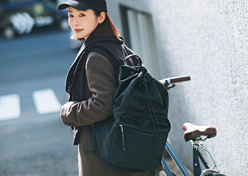 「〝Aeta〟の黒リュックは、最近購入したばかり。開口部がドロスト仕様で、リュック特有のスポーティ感が薄いところがお気に入りです。娘の送り迎えや買い物など、街で自転車に乗るときに選びがち。ハンサムなウールジャケットに合わせて、都会的にまとめます」(川上さん)