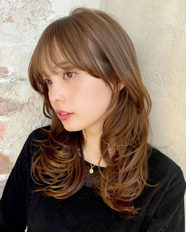 カットベースを鎖骨と胸の間で切り、顔周りにしっかりめにレイヤーを入れます。サイドバングは厚めにすると結んでもかわいく、こめかみ部分が分かれません。前髪は目にかからない長さのシースルーに。