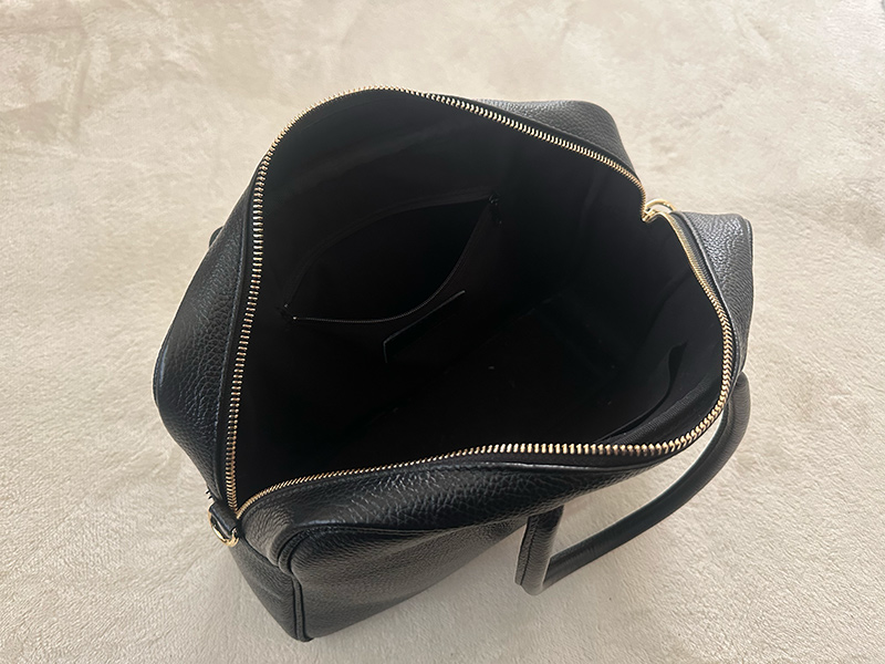 マチも10cmほどあり、収納力も抜群。内ポケットが3つあるのでカードケースやリップなど細かいものも分けて入れられます。ガバッと口が開くので物が取り出しやすいのもいいところ。