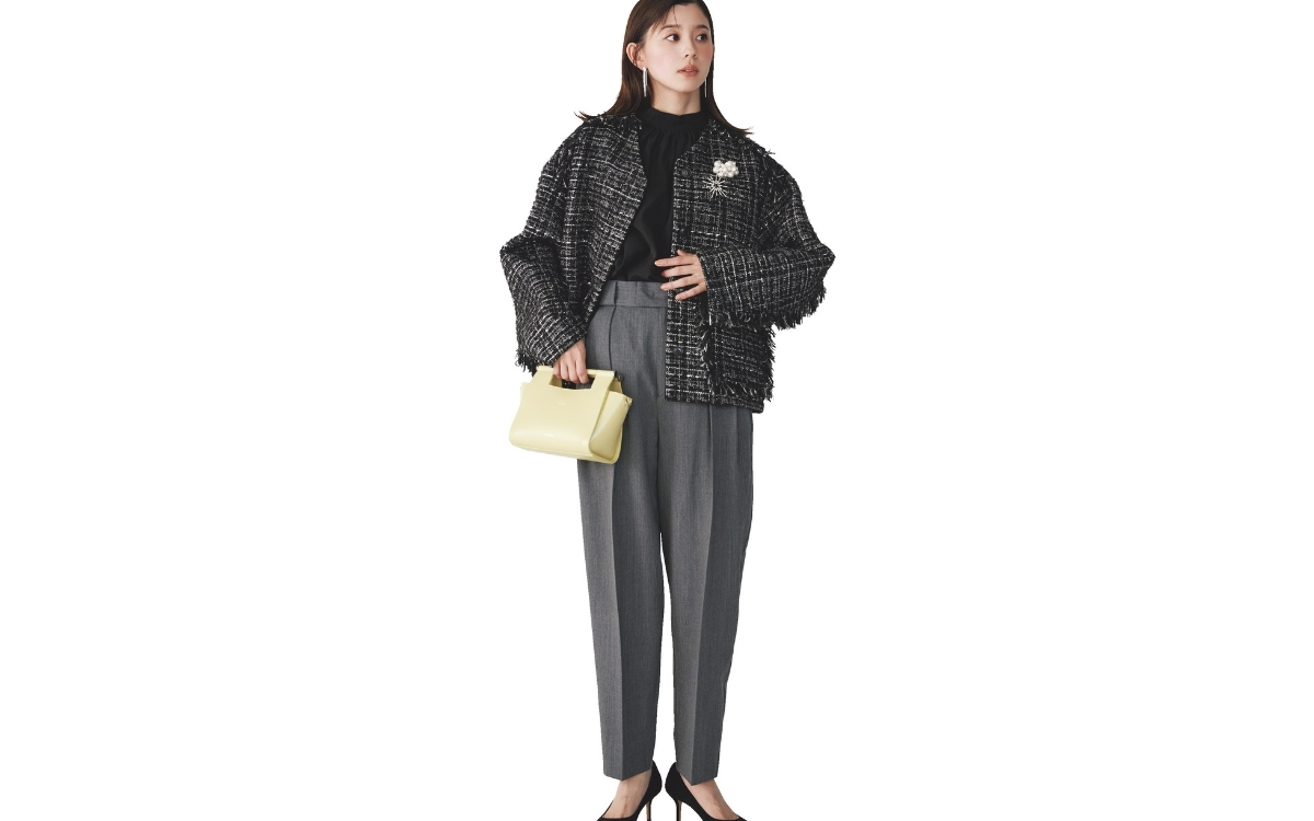 ハイウエスト&センタープレス入りのテーパードパンツが、メリハリの利いた美バランスを形成。お出かけ仕様のツイードジャケットやギャザーブラウスの甘さを、今っぽくセーブしてくれる効果も見逃せない。