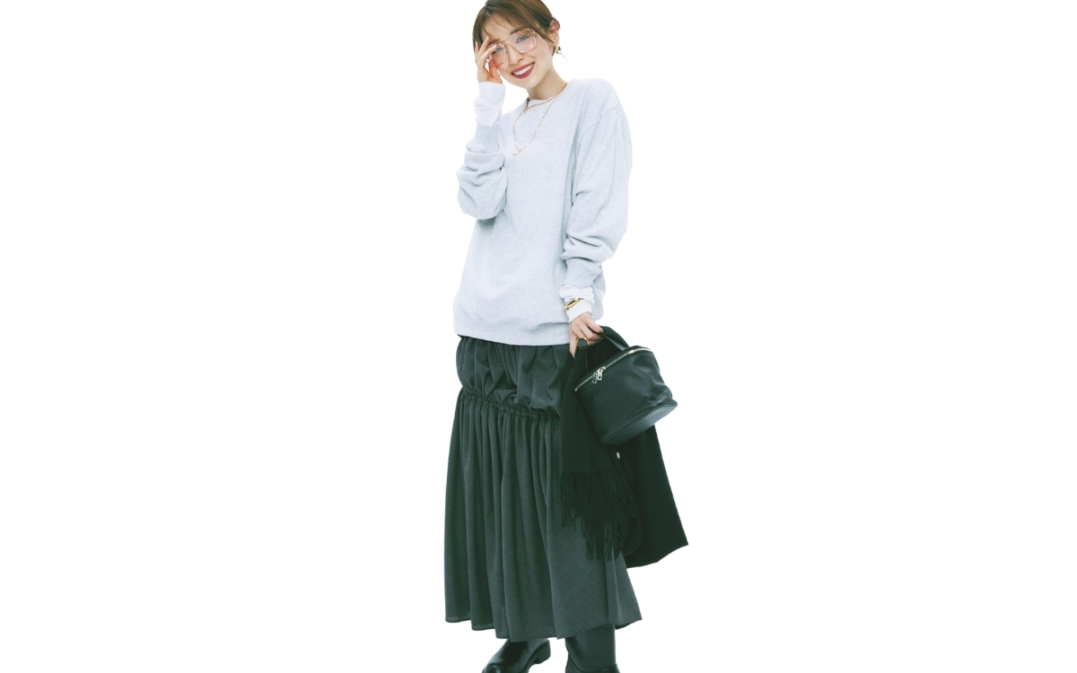 スウェット¥3,157(キャブ〈ユナイテッドアスレ〉) スカート¥52,800(ノーベルバ〈ア ヴァケーション〉) カットソー¥19,800(HER.) バッグ¥47,300(アイネックス〈バケット バゲージ〉) 靴¥19,800(ル タロン グリーズ ルミネ新宿店〈ル タロン グリーズ〉) ストール¥59,400(エイトン青山〈エイトン〉) メガネ¥7,590・ピアス¥3,300(AKTE) ネックレス[短]¥50,600・[長]¥34,100(マリハ) バングル¥13,750(フォーティーン ショールーム〈エイチアッシュ〉) リング¥41,030(ZUTTOHOLIC〈ピニャッタ〉)