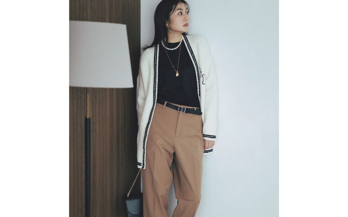 パンツ¥4,990・ベルト¥2,990(ユニクロ) カーディガン¥44,000(ウィム ガゼット 丸の内店〈ゲミニー〉) カットソー¥30,800(プレインピープル青山〈プレインピープル〉) バッグ¥13,750(アルテミス by ダイアナ アーバンドック ららぽーと豊洲店〈アルテミス by ダイアナ〉) 靴¥31,900(アポロ〈ヘンリエンヴァーゴ〉) イヤリング¥13,200(フーブス〈IRIS 47〉) ネックレス[短]¥38,500・ネックレス[長]¥55,000(リューク)