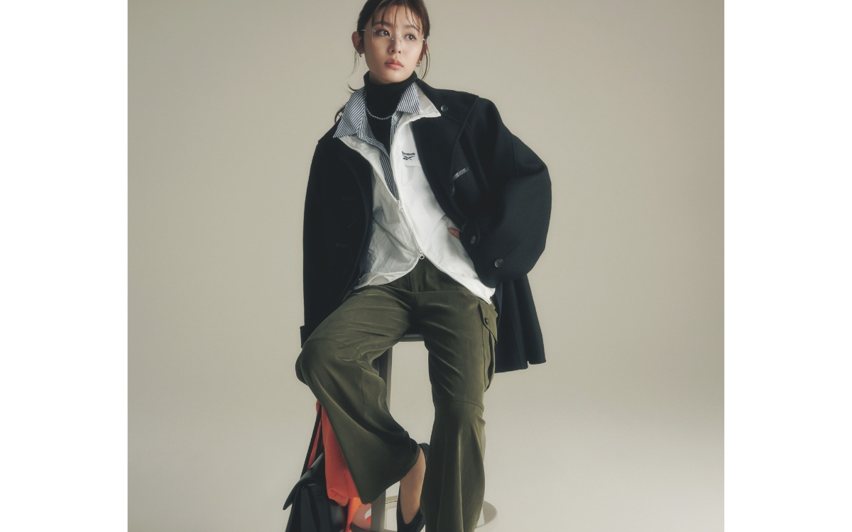コート¥59,400(オンワード樫山〈アンクレイヴ〉) 中に着たジャケット¥49,500(Shinzone OMOTESANDO FLAGSHIP STORE〈THE SHINZONE〉) 中に着たブルゾン¥22,000(アルページュストーリー〈Reebok × アルページュストーリー〉) 中に着たシャツ¥17,600(アプワイザー・リッシェ) 中に着たニット¥16,500(LOUNIE/ルーニィ) パンツ¥24,200(アンタイトル) バッグ¥16,900(チャールズ&キース ジャパン〈CHARLES & KEITH〉) 靴[ヒールの高さ3.5㎝]¥33,000(アポロ〈ヘンリエンヴァーゴ) ストッキング¥3,300(福助〈Femozione〉) 手に持ったストール¥41,800(アイネックス〈アソース メレ〉) メガネ¥25,740(ルックスオティカジャパン カスタマーサービス〈レイバン〉) ピアス¥242,000(マリハ) ネックレス¥26,400(プラス ヴァンドーム)