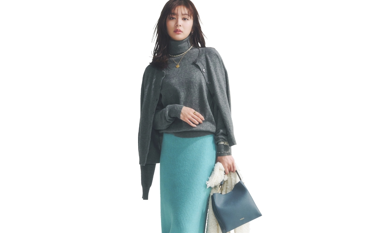 カーディガン¥20,900・ニット¥19,800(N.O.R.C〈ノーク〉) スカート¥13,200(マイストラーダ) 手に持ったジャケット¥24,200(Stola./ストラ) バッグ¥74,800(フルラ ジャパン〈FURLA〉) 靴[ヒールの高さ7.5㎝]¥9,900(チャールズ&キース ジャパン〈CHARLES & KEITH〉) ストッキング¥1,980(17℃ by Blondoll 横浜ジョイナス店〈17℃〉) 時計¥20,900(エイチエムエスウォッチストア 表参道〈マトウ〉) ピアス¥51,900(トムウッド 青山店〈トムウッド〉) ネックレス[短]¥59,400(フーブス〈quip queint〉) ネックレス[長]¥27,500(マリハ) ブレスレット¥297,000(ヴァンドーム青山 プルミエール 伊勢丹新宿店〈ヴァンドーム青山〉) リング¥27,500(プラス ヴァンドーム)