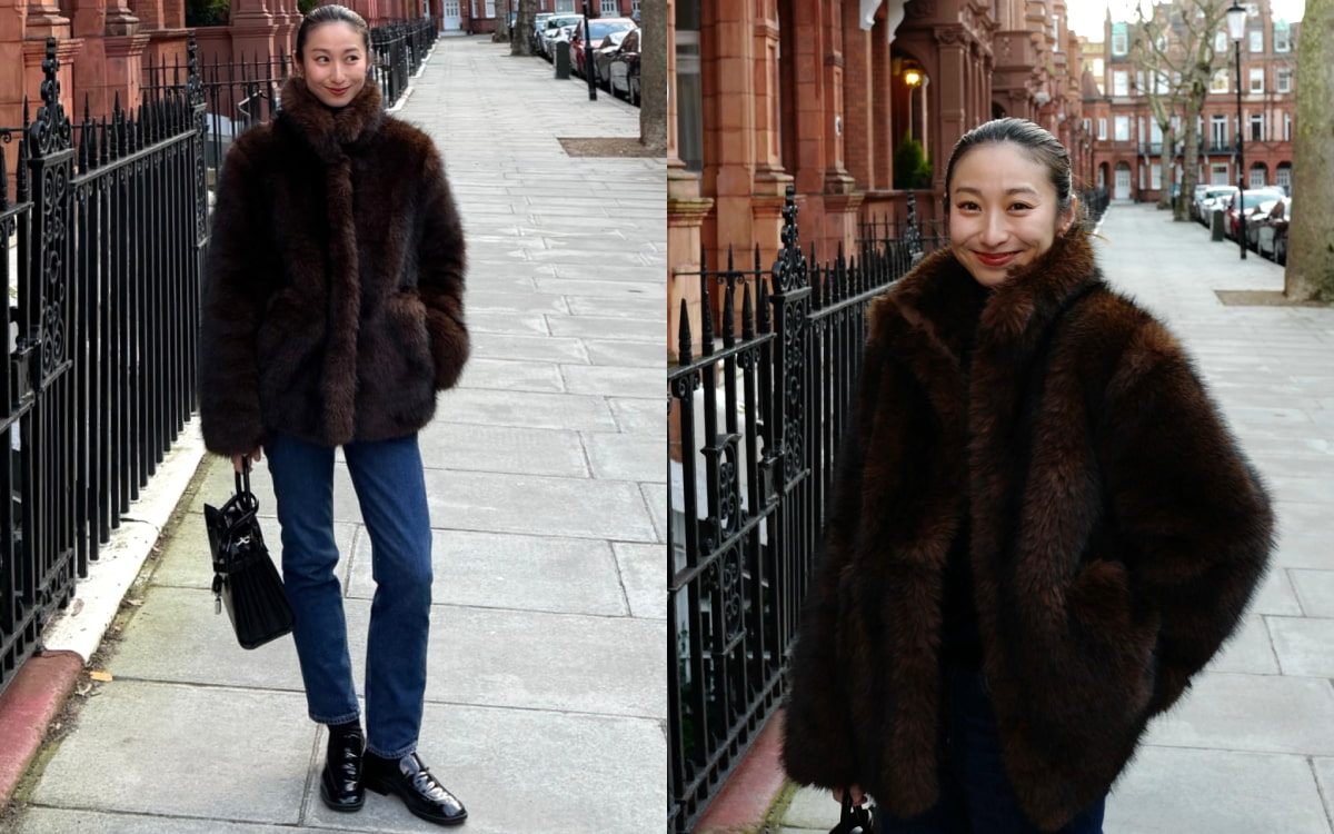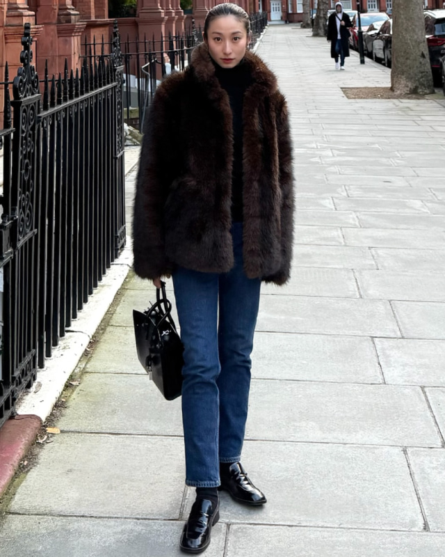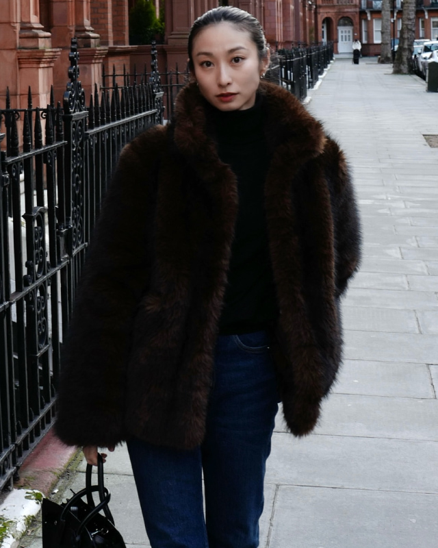 この日は、ハイ・ストリート・ケンジントン駅から少し歩いた所にある、メンズのヴィンテージショップに行く予定で、カジュアルな装いにしました。ゴージャスな印象になりやすいファーですが、デイリーにも使えるブラウンカラーのファーコートを主役にコーディネート。ブルー寄りの細身デニムに、インナーはシンプルにブラックのタートルネックを合わせてすっきりと。ファーにボリュームがあるので、ボトムはタイトにしてバランスを考えました。小物は、ロンドンの街に馴染むように、カッチリとしたバッグにローファーでトラッドな要素をプラス。
