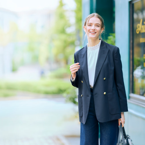 ベーシックなデザインながら、ほどよくゆとりを持たせたシルエットで着やすいダブルブレザー。襟は顔まわりがすっきりと見えるピークドラペルデザインで、ヒップにかかる丈感は腰回りをカバーしながらスタイル良く見せてくれます。