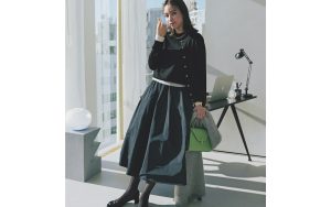 ジャケット¥44,000(オンワード樫山〈アンクレイヴ〉) シャツ¥36,300(エイトン青山〈エイトン〉) 中に着たカットソー¥12,100(カデュネ) 肩に巻いたカーディガン¥28,600(アバハウスインターナショナル オンラインストア〈ルージュ・ヴィフ〉) スカート¥24,200(LOUNIE/ルーニィ) バッグ[大]¥33,000・[小]¥16,500(ヴァジックジャパン〈VASIC〉) 靴[ヒールの高さ5㎝]¥24,200(銀座かねまつ6丁目本店〈銀座かねまつ〉) ストッキング¥660(福助〈満足〉) スカーフ¥9,900(アンタイトル) 時計¥27,500(エイチエムエスウォッチストア 表参道〈マトウ〉) ネックレス¥79,200(ヴァンドームヤマダ〈エル・エー・エイチ〉)