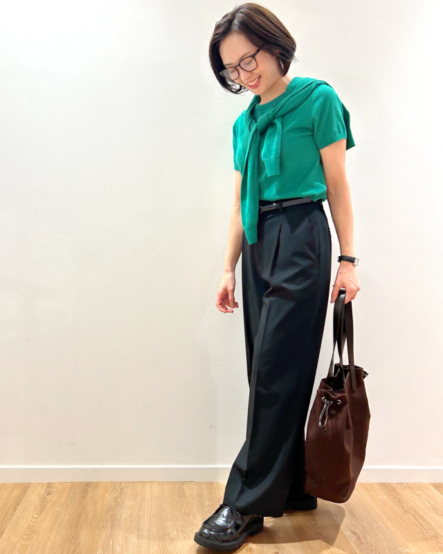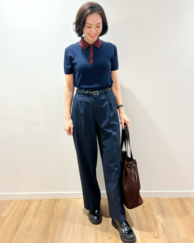 上品さがあるのに堅苦しくないユニクロのポロセーターは、パンツにもスカートにも合わせやすい。洗濯機でも洗えて毎日の通勤にぴったりのアイテムだと思います。きちんと感がでるタックワイドパンツと合わせると、洗練されたオフィスコーデが完成。ポロをタックインしてベルトをすることでメリハリが出てきれいめに。