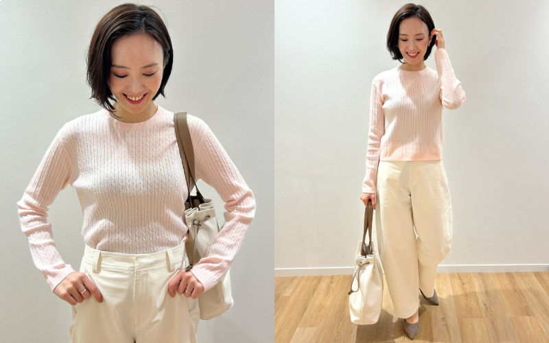ミニケーブルクルーネックセーターは程よい編みのケーブルが上品で春らしいトップス。なにより肌ざわりが気持ちよく、グレーやブルーなど色違いもそろえたい! 丸みのあるバレルシルエットのワイドパンツは脚を長くきれいに見せてくれる^^ 軽くて動きやすい感じ、ぜひ試着して体感してほしいです。ハリ感がある素材のパンツなので、トップスをインして通勤のきれいめコーデにもぴったりです。