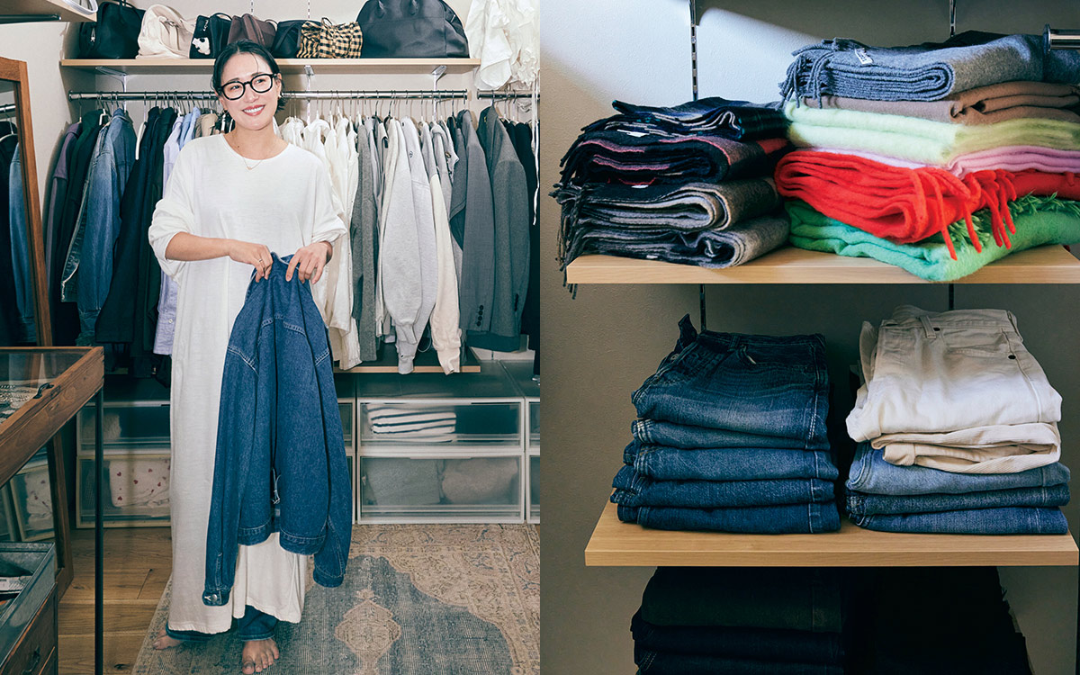 「収納するアイテムに合わせて高さを調節できる可動棚には、アイテムをたたんで収納。季節を問わず私の着こなしの軸になるデニムは色別に、今の時季よく手に取るストールは上段に」(真実さん)