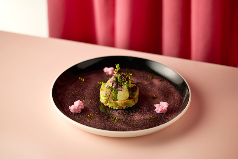 甘エビをアボカドやトマトと合わせ、タルタルに仕立てた一品。甘エビの自然な甘みととろける食感を、爽やかな柑橘の酸味が心地よく引き立てます。桜の花やオリーブオイルパール、ハーブが、春らしさを呼び込むワンポイントに。