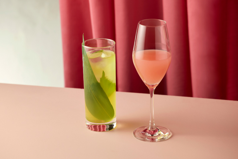 照葉樹林の静かさを映した一杯。緑茶とボタニカルウォーターをベースに、大葉や山椒などの深い緑と清らかな自然の恵みが、身も心もリフレッシュしてくれること間違いなし。(写真左)