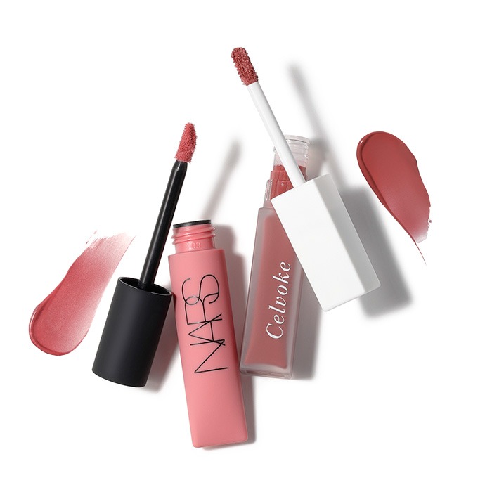 〈左〉クッションのように柔らかくフェザーのように軽いつけ心地。クリーミーな質感を残しつつソフトフォーカスされた仕上がりに。NARS エアーマット リップカラー 2680 ¥3,850