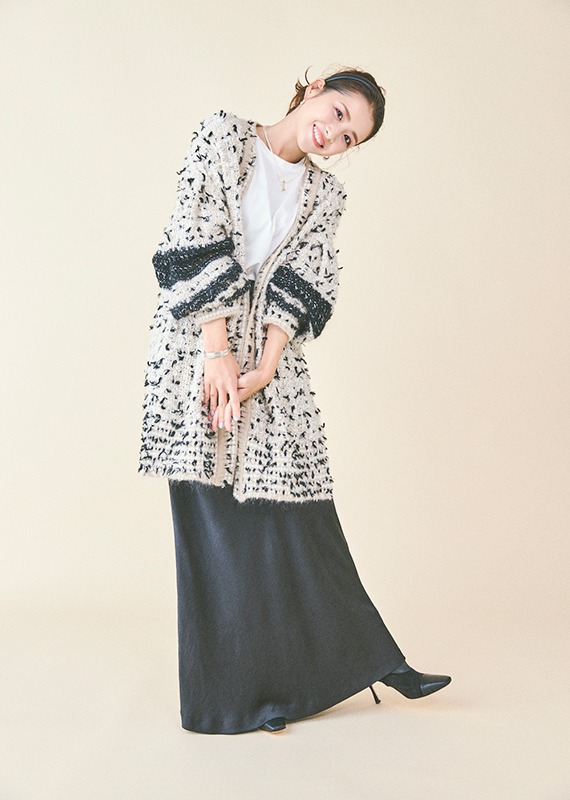 コーディネートの主役はジャガードニットのカーディガン。オーバーサイズのトップス+マキシ丈スカートのルーズなシルエットに、華奢な足元で女らしさを添えて。ピンク系のメイクがモノトーンの色合いに映える!