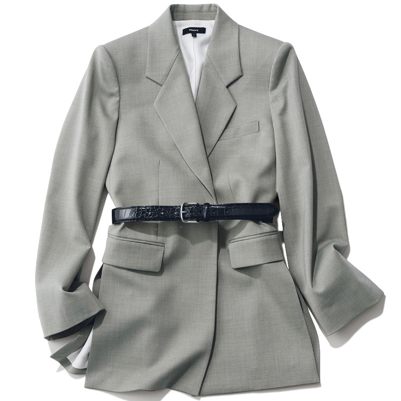 今シーズンの〝セオリー〟が提案するのは、ボタンレスなジャケットのベルテッドスタイル。黒のベルトでよりシャープな印象に。