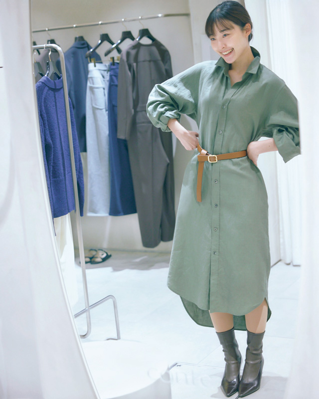 「難しそうな印象のスタイルですが、これなら真似しやすい! ワンピースで体型をカバーしつつ、ベルトでスタイルアップも叶う、うれしいバランス♡」(オッジェンヌ 牛丸麻衣子さん)