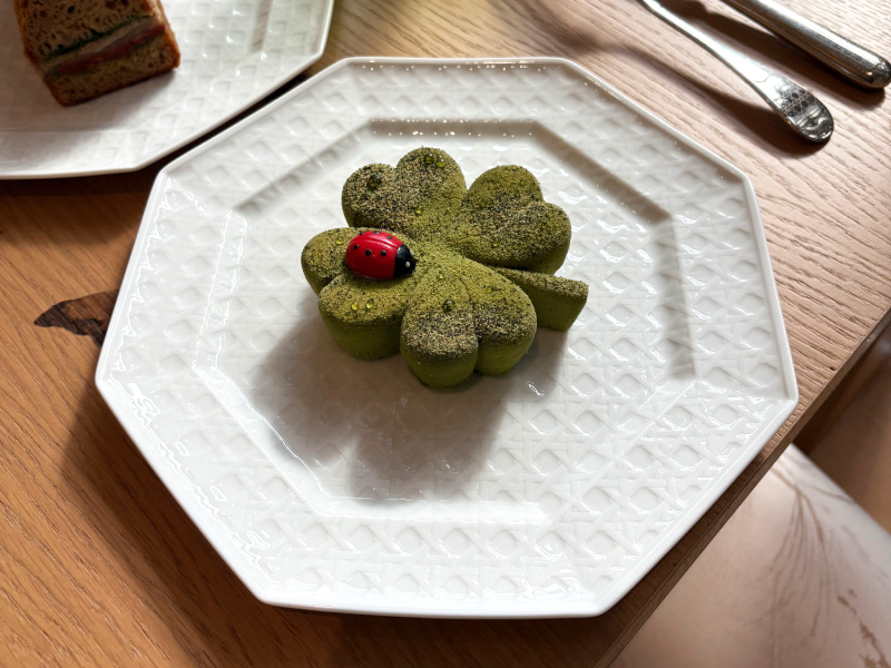 トップには、てんとう虫のチョコレートが。幸運の象徴を忍ばせた、愛らしくも凛とした一皿です。ひと口目の印象は、抹茶のほろ苦さ。その後に、柚子の爽やかな酸味が広がり、最後にピスタチオのコクが口の中に静かに残ります。甘いのに重くない。繊細なのに印象的。「特別なデザートを食べた」という確かな満足感が、ゆっくりと体に巡っていきます。