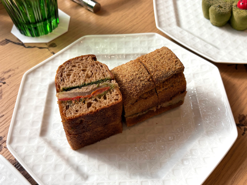 南仏で人気の「パン・バニャ」から着想を得てアレンジした一品です。だったんそば茶を練り込んだパンに、旬の野菜、マグロのマリネとバジルペーストを重ねた、断面が美しい洗練されたサンドイッチです。軽やかでいながらも、しっかり満足感があり、ランチとしても十分なボリューム。甘いものが得意でない人ともシェアしやすいのも魅力です。
