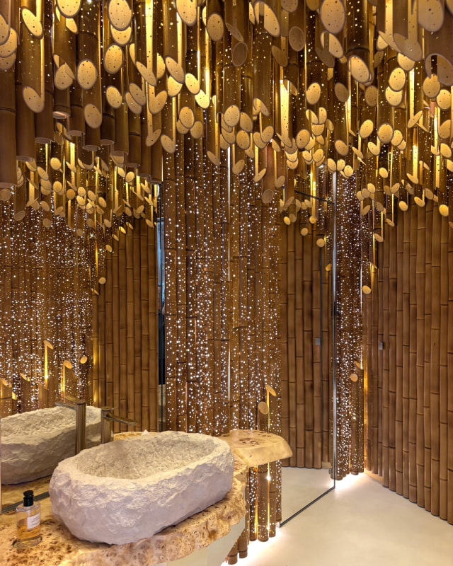 カフェでゆっくりした後にぜひ行っていただきたいのが、ゴールドの煌びやかなお手洗い。細部にまでこだわったバンブーモチーフのデザイン空間は、気分だけじゃなく運気まで上がりそう。