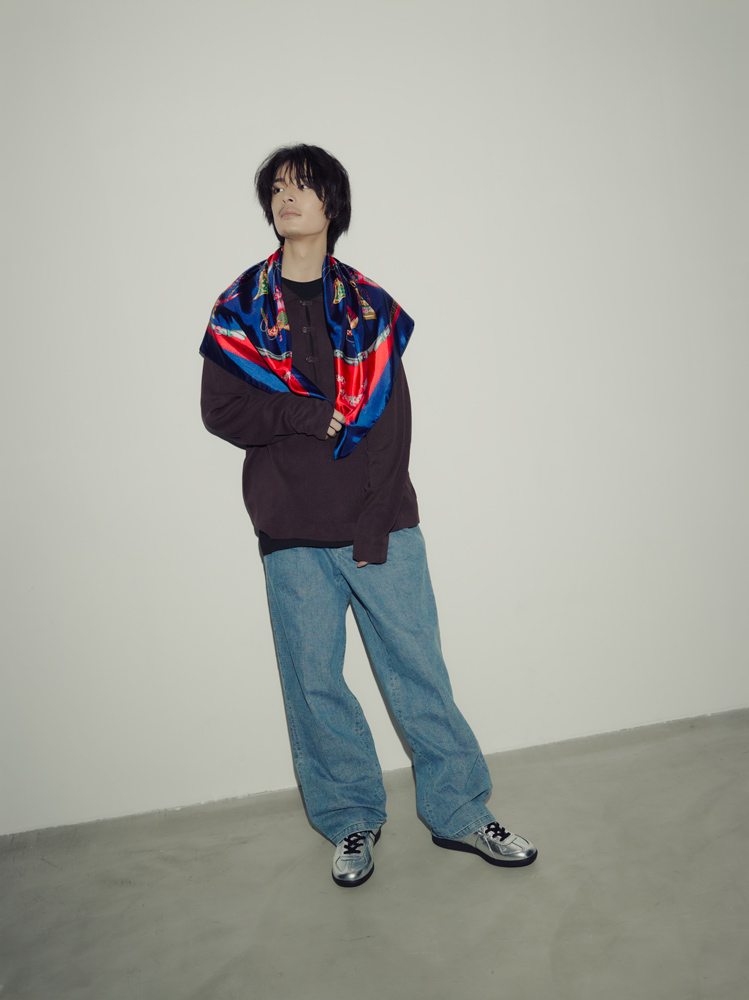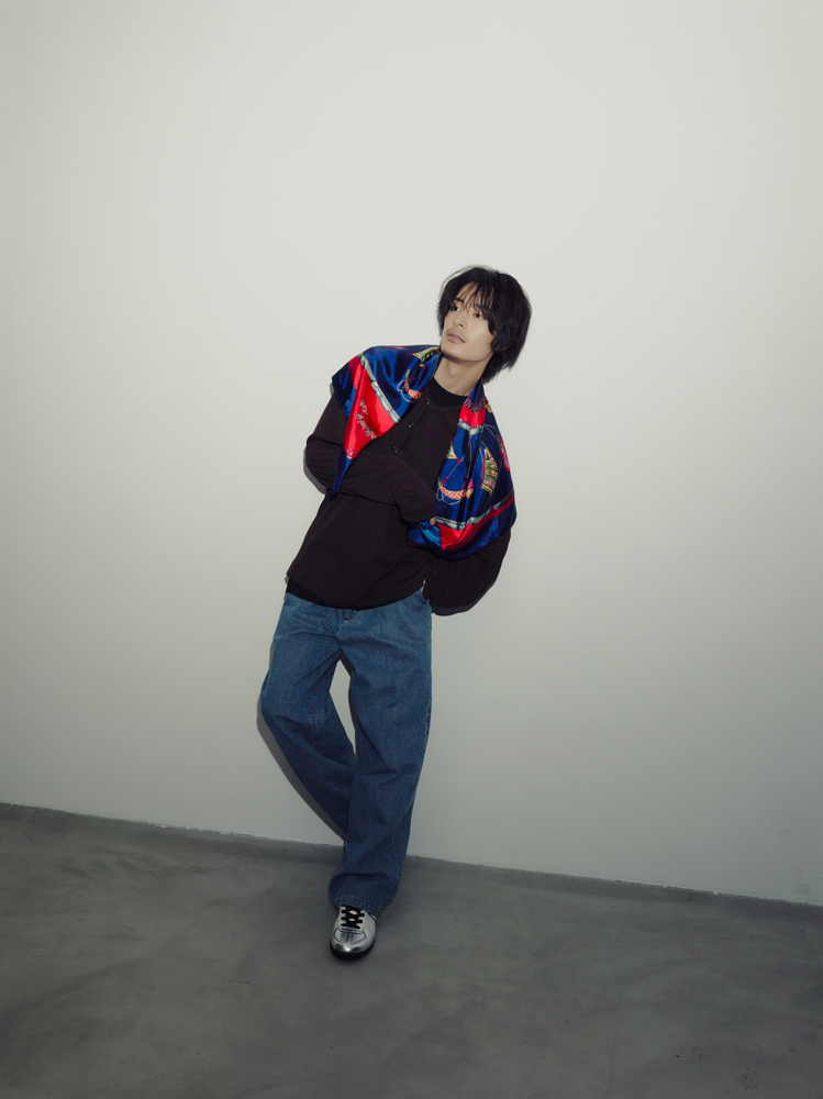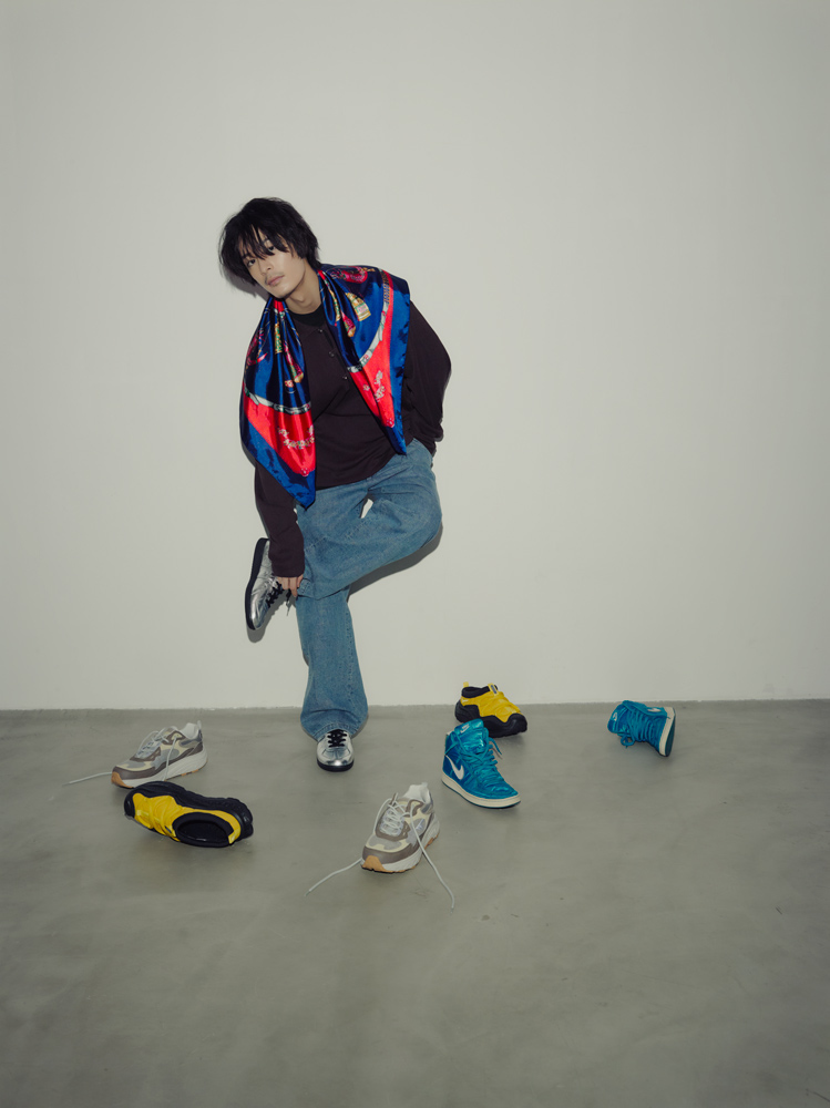 今回着用したスニーカーは、シルバーのボディでインパクトがありますよね。普段の僕ならこういう強い印象のスニーカーははかないですが実はちょっと憧れていました(笑)。財布など、シルバーの小物はいくつか持っているのですが、スニーカーはほしいなと思いつつも、なかなか手が出なかったアイテムなので、今回挑戦できてよかったです。撮影での一番の感想は、やっぱりスタイリングの仕方でビシッと決まるんだなということ。