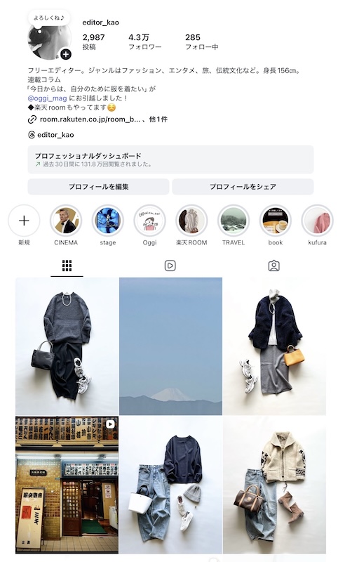 そして今回は、自己紹介ついでに宣伝を。editor_kaoのインスタグラムでは、日々のコーディネートや、大好きなエンタメ(お笑い、音楽、演劇、映画、アート)などを更新しています。コーディネートは完全私物なので、同じような着こなしが続いたりするのですが、そんなリアリティも楽しんでいただけたら!