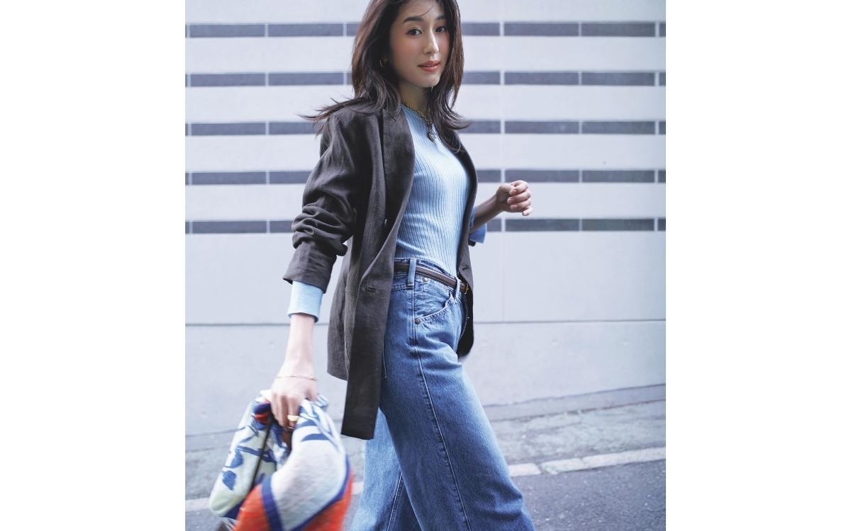 定番のブルーデニムはトレンドのブラウンジャケットと合わせてフレッシュさを際立たせて。