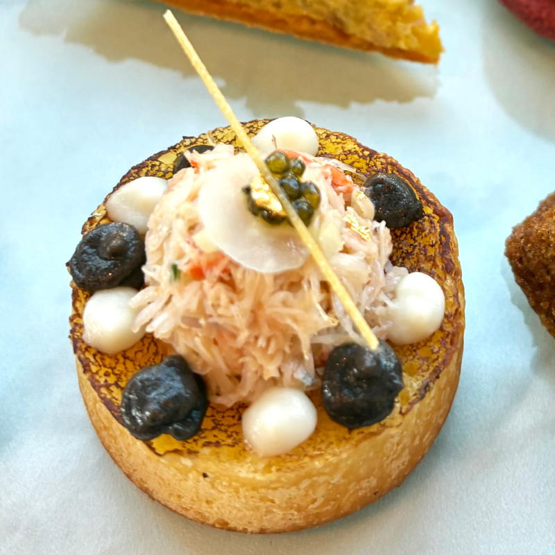 セイボリーの「蟹のブリオッシュムースリーヌ」は、しっとり柔らかなブリオッシュに、蟹のタルタル、カリフラワーとトリュフのピューレ、キャビアを重ねた贅沢な構成。リッチな食材を使用し、時計の文字盤モチーフの装飾も入って、今回のテーマ性とホテルらしい満足感がきれいに両立しています。
